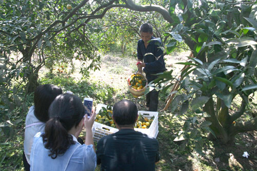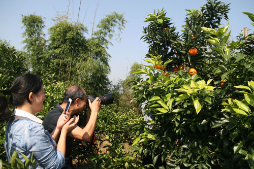 随后,采风团一行来到了赵家镇桂花村。下车伊始,文艺家们举目四望,不仅连连赞叹,满山尽是绿葱葱的叶,黄澄澄的果,错落有致的院落掩映在桔林中,水泥路通村达社,石板路连通院落,柑桔树下的果农们正在忙着采摘,个个喜气洋洋,好一派丰收、和谐、富裕的新农村景象。