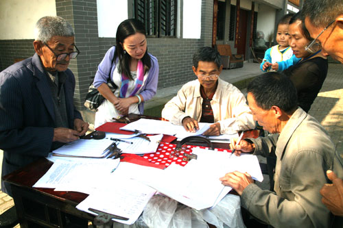 >市文联副主席肖朝萍(左二)在二东村和村民交谈<