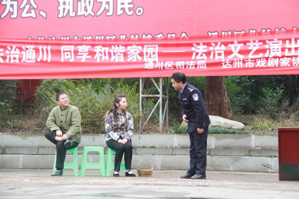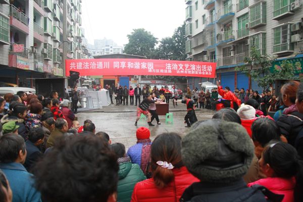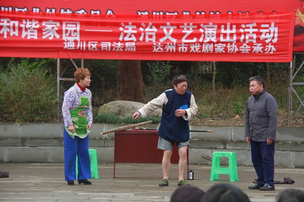 本网讯 2016年1月11日上午和下午,由达州市戏剧家协会组织的以“宣传法治·和谐共建”为主题的文艺演出活动分别走进通川区复兴镇和通川区北外高家坝社区。