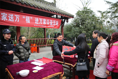 在活动中,达州市书法家协会主席、巴山书画院院长马骏华,达州市书法家协会副主席、秘书长侯忠明,达州市书法家协会副主席凌灿印,李小军、付国等书法家,现场挥毫泼墨,精心创作,为当地百姓书写了风格各异的“福”字书法作品和春联。春联既有挥别羊年、喜迎猴年辞旧迎新的美好愿景;也有歌颂党恩、宏图大展的励志高歌;更有经济繁荣、百业火样红的幸福美景。一对对吉祥喜庆、墨宝飘香的春联,让前来求“福”、求春联的百姓欢喜不已,村民们脸上堆满了笑容。活动现场百姓络绎不绝,高峰是一波接一波。