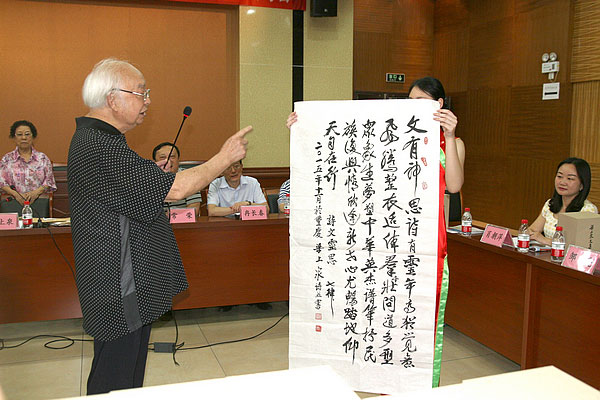 首发式后举行了梁上泉先生文艺创作七十周年研讨会。先生讲述了创作经历及体会,朗诵了自己的诗歌。已是85岁高龄的梁老,虽然身名显赫,享誉文坛,但却特别低调谦和。梁老自谦说:“自己搞了70年文艺创作,我从来都是有什么需要就写什么,快板、曲艺、歌剧都有。这次出文集里面包含了剧本、诗歌、歌词,很多人问我到底是做什么的,为什么什么都干,我只想说我是‘文艺打杂工’,人民需要什么我就写什么。人民的需要、听众的需要,能满足这些我就很高兴了。”