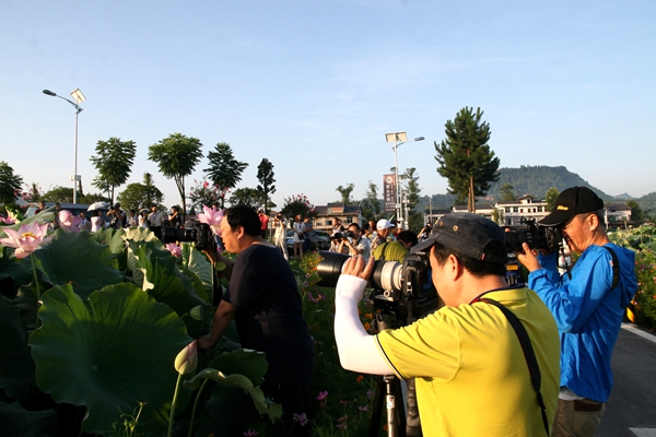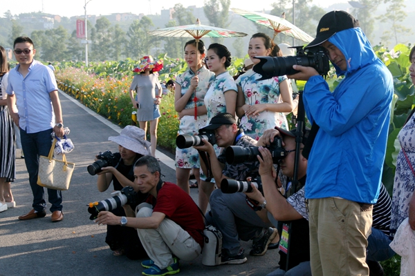 在此期间,市摄影家协会还邀请南充、广安、巴中、粱平等地的摄影家共100多人,一同参加了“魅力开江”第三届荷花节采风活动。“在清晨霞光的映衬下,荷花与露珠相得益彰,真是一种别样的美,荷花现在俨然成了开江的一张特色名片。”来自巴中市平昌县的摄影师孙百川正拿着相机兴奋地拍摄着朝阳下的荷花,娇艳的荷花、穿着美丽旗袍的模特们、专注的摄影师们,构成了开江荷塘清晨一道独特的美丽风景线。