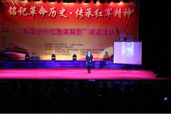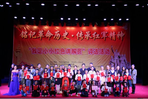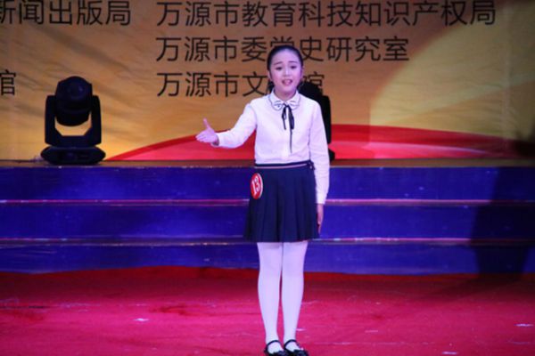 决赛现场,30名“小小红色讲解员”分成初中组和小学组两个组同台竞技,一决高下。在模拟讲解环节中,参赛小选手们将《半截皮带》、《红色第一缸》等与红色文物相关的故事,以及许世友、张开基和熊国炳等与红军英雄相关的故事娓娓道来,让现场观众们入临其境,思绪再次回到战火纷飞的红色革命战争年代,一次次重温了红军将士浴血奋战、不惧牺牲与团结一心的英雄豪情与革命风采。模拟讲解结束后,初中组排名前6名的小选手与小学组排名前10名的小选手分别进行了才艺展示。才艺展示中,二胡独奏、快乐体操表演、舞蹈表演、歌曲演唱、朗诵诗篇、语言表演、舞蹈技巧展示、讲情景故事等丰富多彩的节目形式,以及小选手们极富深情的表演,让观众们享受到了一场场美轮美奂的视听盛宴。其中,全场年龄最小的7岁小选手周芸熙表演的京剧红灯记《仇恨入心要发芽》,最令人拍案叫绝。早在有板有眼进行模拟解说时,周芸熙就引起了观众们的特别关注。她一身红色戏服装扮出场,一条麻花辫直垂腰间,刚往舞台中间一站,全场便响起了雷鸣般的掌声。她以清脆悦耳的童音,以有模有样的台步,以铿锵有力的表达,将这段京剧演唱得酣畅淋漓,让观众听得如痴如醉,并不断拍照发往自己的微信朋友圈与QQ空间分享。
