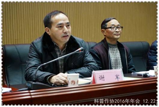 市文联党组成员、副主席兼秘书长谢军在讲话中说,2016年科普作协的工作得到了市委包书记亲自批示,充分肯定了大家的成就,可喜可贺!要求全体作家们要更加勤奋,拿出精品力作,为达州市的科技、经济、文化发展做出更多贡献,无愧于人民,无愧于时代。他对协会今后工作提出了期望,强调指出:一要坚持正确的政治导向,坚持文化自信,坚持对传统文化的自信,认真学习习总书记的讲话,领会精神,不断创新;二要脚踏实地创作,干净做人,深入基层,努力创新文艺作品,多出精品;三要多组织采风科考活动,活动是一个协会生命力的源泉;四要加强协会管理,实现行业自律,遵守文艺创作规律,坚守理想,协会领导团队起好模范带头作用;五要培育大师,培育人才,把有创作实力热心协会工作的作家吸引到作协管理层。期待科普作协2017年创作辉煌。