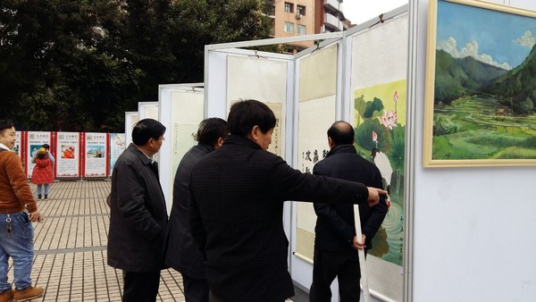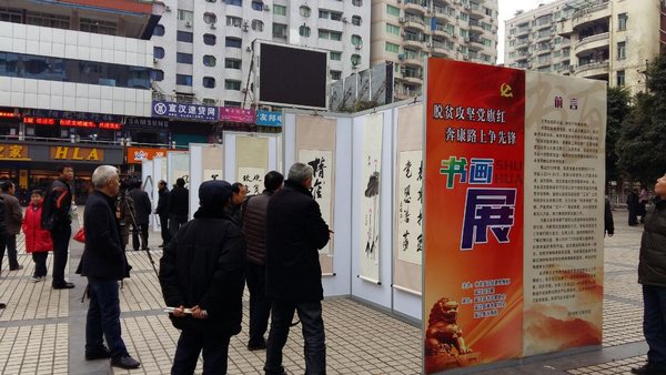 本网讯 为全面展示广大党员干部群众实施精准扶贫的生动实践,12月22日,宣汉县在城区东门广场举办了以“脱贫攻坚党旗红•奔康路上争先锋”为主题的书画展,为观众呈献一道创意独特的“视觉盛宴”。