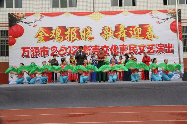 本网讯 春节期间,由万源市委、市人民政府主办,万源市委宣传部、万源市文广新局承办、万源市文联、万源市黄钟镇、万源市文化馆协办的2017年“金鸡报晓 歌舞迎春”新春文化惠民文艺演出来到万源市黄钟镇中学操场,现场欢歌笑语、热闹非凡。