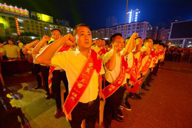 “我志愿加入中国共产党……”,演出中,伴随舞蹈群唱《宣誓的画面》,在主持人领誓下,上万市民在现场1500多名党员干部的示范下,齐齐举起右手,朗读入党誓词。