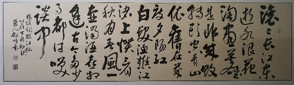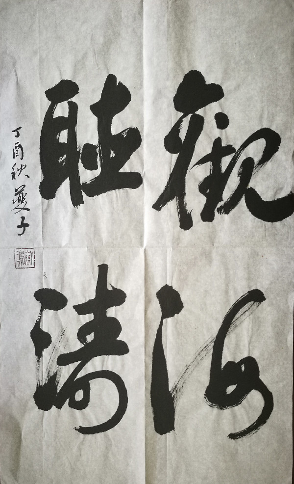 李明荣先生喜诗书词赋,更潜心瀚海,痴于泼墨书法。他对匾额、楹联、碑文中如意文字,总要驻足心摹手追,遇到心仪之帖立即购买;他对唐碑、晋帖、魏碑,《石门颂》《石门铭》《瘞鹤铭》习研多年,颇有心得;他从欧字入手,广泛涉猎二王、李邕、钟繇、张黑女等帖;为深研《瘞鹤铭》,曾不惜千里迢迢去镇江焦山碑林亲睹;为弄清文字发展,亲临河南周口地区考察……他的案头常常是笔砚楚楚,素褚齐备,字帖满目。上世纪八十年代初,他就成为达川地区首批书协会员、省书协会员,多次参加全国及省地书展并获殊荣。