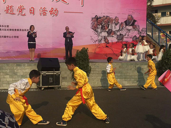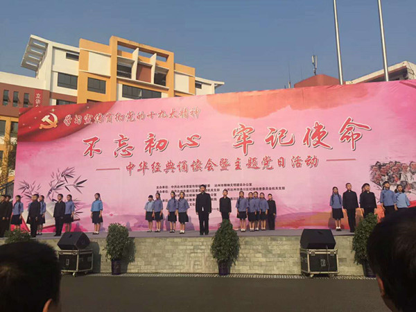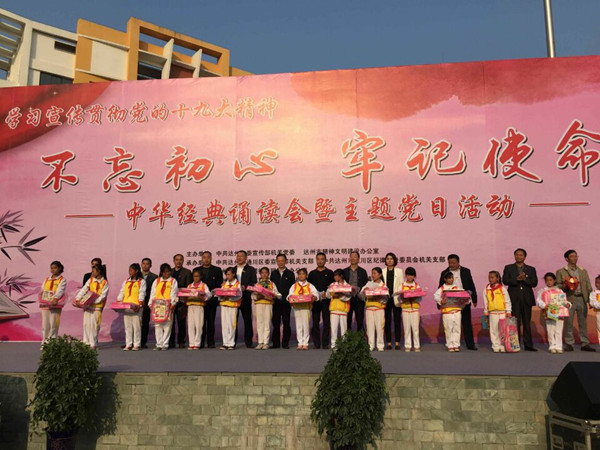 随后,党员们来到操场上,参加以“不忘初心,牢记使命”为主题的中华经典诵读会,市委宣传部常务副部长冉长春发表讲话。在诵读会上,全体党员同志富有激情地朗诵了《中国的十月》,并欣赏了由通川区各小学带来的《中华之根,华夏之魂》《春》《声律启蒙》《匆匆》《蒹葭》《少年中国说》《至善在这里生长》等朗诵,党员们赞叹不已,对中国传统文化有了更加深刻的认识。活动结束前,党员代表们为留守儿童赠送了书包、文具等学习用品,小朋友们也回赠自己手工制作的小礼物表示感谢。