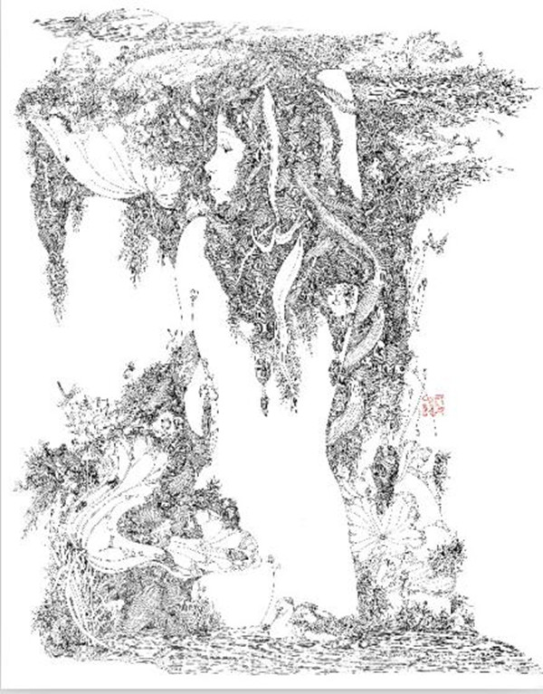 与郭玉川的油画展现的大巴山景物不同,他的线描画皆以表现东方女性柔美为主。他用朗硬的笔触述说柔性的故事,在画面整体的浪漫婉约之下,是线条的绝对理性和严谨,像纳鞋底的老太太,像缝合创口的医生,用他的话说,就是小心翼翼地在享受这些线条带来的快乐和成就感。