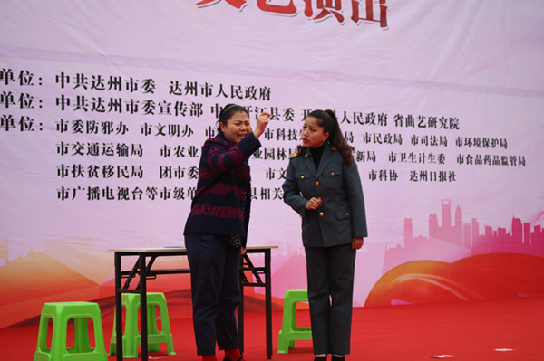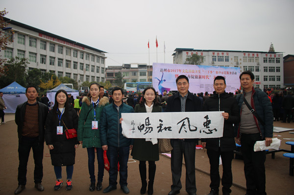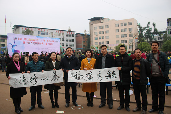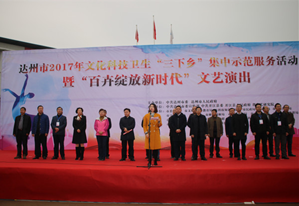 【本网讯】为深入学习贯彻党的十九大精神,11月28日,由中共达州市委、达州市人民政府主办,中共达州市委宣传部、中共开江县委、开江县人民政府、省曲艺研究院承办,市文联等多家单位协办的2017年达州市文化科技卫生“三下乡”集中服务活动暨“百卉绽放新时代”文艺演出在开江县广福镇初级中学举行。达州市委宣传部副部长方江出席活动并致辞,活动由市委宣传部机关党委书记成娟主持,市文联副主席肖朝萍出席活动。