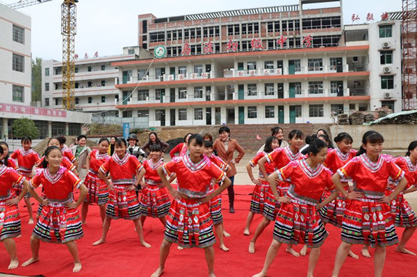 在宣汉县马渡初级中学操场上,参加活动的文艺工作者们首先观看了学生们表演的《土家摆手舞》,接着文艺工作者向同学们请教现场学起了《土家摆手舞》。