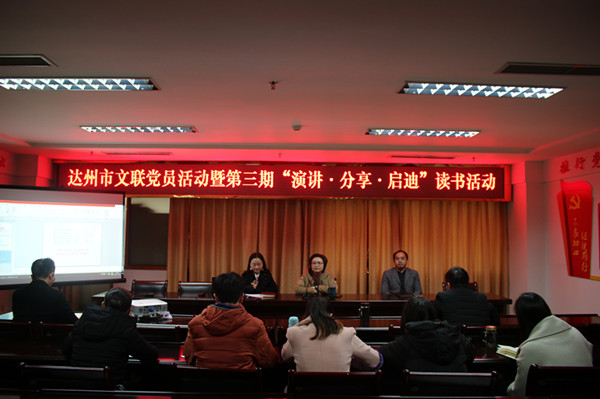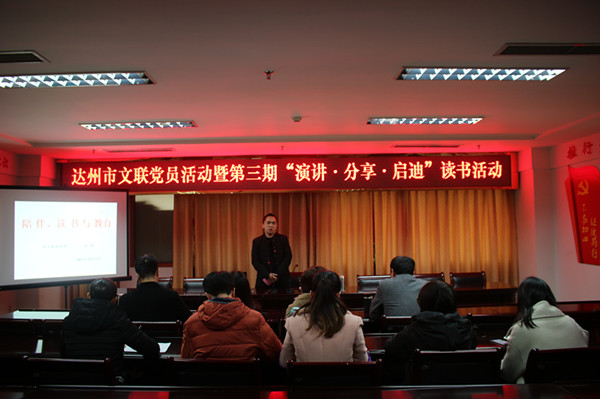 【本网讯】12月6日,达州市文联开展“党员活动”暨第三期读书活动,市文联组联部主任杜涛以《陪伴、读书与教育》为主题,分享自己的读书体会。市文联主席吴洁如、副主席兼秘书长谢军出席活动并做了精彩点评,副主席肖朝萍主持本期读书活动。