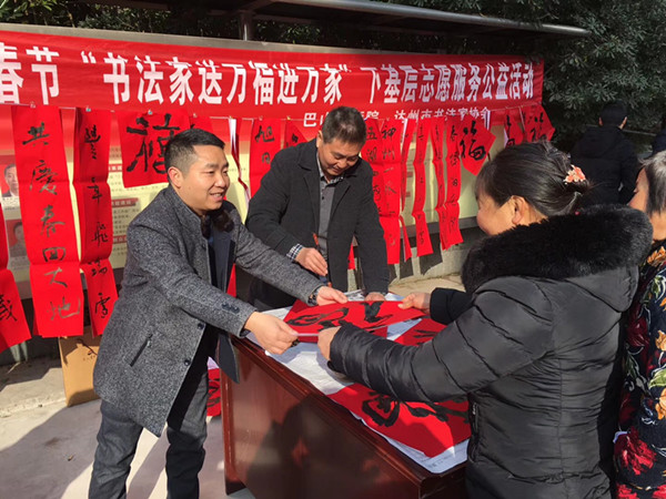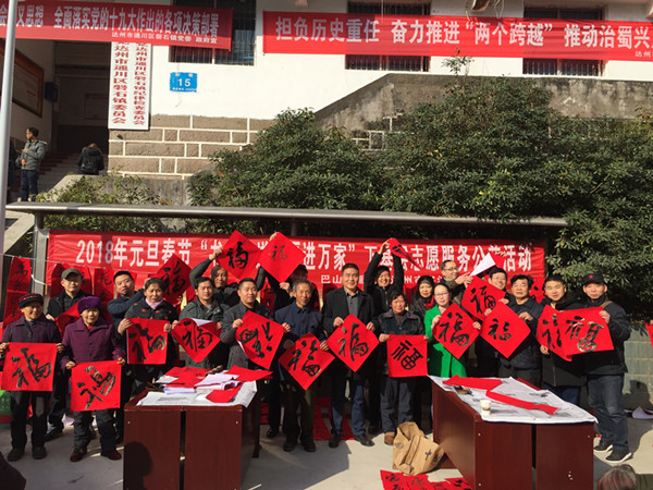 【本网讯】1月9日,达州市2018年元旦春节“书法家送万福进万家”下基层志愿服务公益活动持续升温。达州市书法家协会主席、巴山书画院院长马骏华组织我市书法家彭闽湘、凌灿印、何三辉、付国、李小军、邓洪玉、张林、李松远、王成林、庞晓涛、陈明、孙瑞和、彭忠国、向以成等15余人组成送福小分队,前往通川区磐石镇为乡亲们送“福”、送温暖。