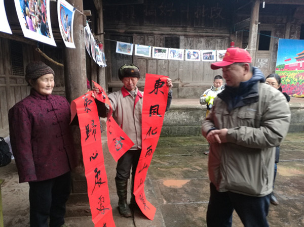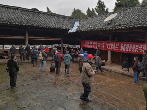 时值隆冬,小分队与风雪同行,重温红色记忆,见证老区发展,送上文艺惠民服务。1月24日走进万源市秦河乡三官场村(中国传统古村落),队员们迅速就地拉起流动摄影展览、组织拍摄全家福、现场打印送照片、赠送年历、福字和春联、赠送摄影画册。满堂群众看摄影展、领春联、照全家福,现场气氛浓烈。老师们在现场还与群众进行手机摄影手把手辅导,与基层摄影人进行摄影交流,针对性的走访了古村落建筑、观看雕花工艺、县衙赠送“五世同堂”褊牌、新农村示范点新貌等,见证了老区发展面貌。