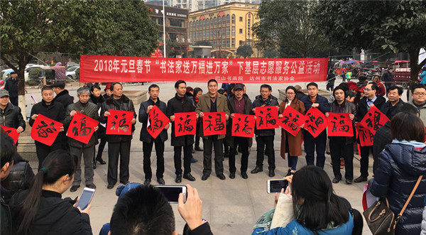 【本网讯】2月2日,风暖莺娇、天气和煦,达州市2018年元旦春节“书法家送万福进万家”下基层志愿服务公益活动送福队伍又马不停蹄、兵分两路赶往渠县天星镇以及大竹县石桥铺镇指挥村,为两地群众送上最真挚的问候与祝福。
