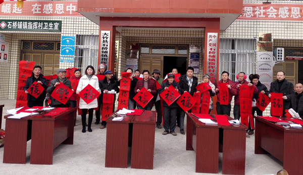另一送福活动也于相同时间在大竹县石桥铺镇指挥村进行,指挥村是市委宣传部的定点帮扶贫困村,在市委宣传部机关党委书记成娟带领下,书法家为村民们送福、送文化、送温暖并慰问全村所有的贫困户。书法家们的到来让村民们欢呼雀跃,纷纷表示将新春祝福通过这种独特的形式传递给大家,真正将党和政府的关怀送到大家家门口。书法家凌灿印、冯圣城、饶德模、吴树、王景元、罗宇等6人为指挥村的父老乡亲们送出春联、福帖300余件。
