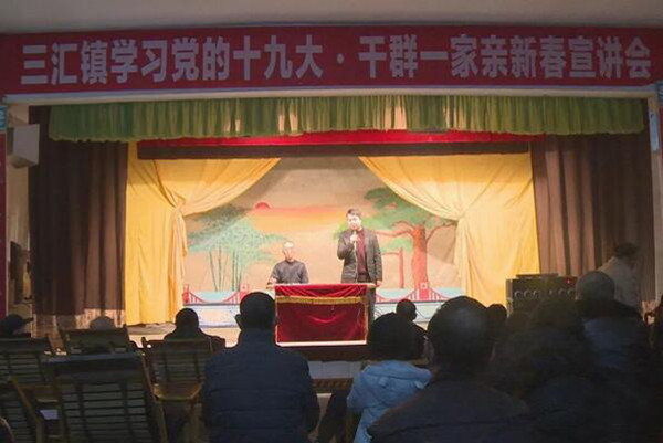 【本网讯】3月2日,正值农历的正月十五,四川渠县三汇镇“学习党的十九大,干群一家亲新春宣讲会”在彩亭茶园举行,78岁的老党员、三汇镇一小退休教师胡美华应邀用川剧形式宣传党的十九大精神。100余名干部群众济济一堂,度过了一个有意义的元宵佳节。