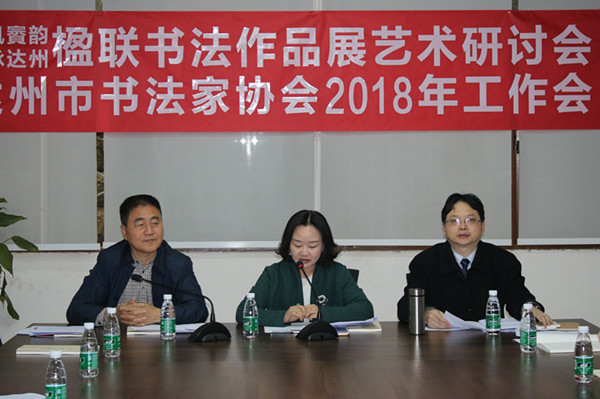 随后,“巴风賨韵·联咏达州楹联书法作品展”艺术研讨会、达州市书法家协会2018年工作会在巴山书画院举行。出席会议的有市文联副主席肖朝萍,达州市书法家协会主席、巴山书画院院长马骏华,达州市书法家协会副主席侯忠明、魏艳、彭闽湘、凌灿印以及各县(市、区)书协主席、秘书长、市直机关单位代表40余人。会议由马骏华主持。
