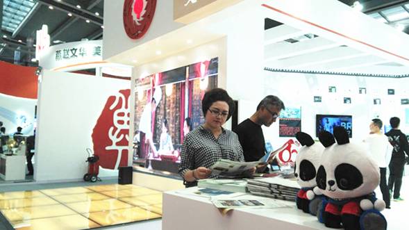 图:达州市文联主席吴洁如在四川展区翻阅展会资料