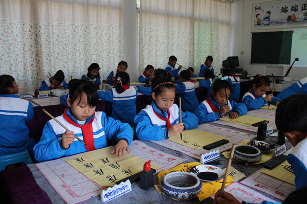 万源市茶垭学校是一所农村学校,书法教育作为该校打造的校园文化,深得学生喜欢。茶垭学校由校工会牵头,成立教师书法社团,每周二、四放学后固定一小时让教师集中练习。学校还成立少年宫活动小组,开设书法兴趣班,每周二、四下午放学后,由书法专业能力强的老师担任辅导老师指导学生研习书法,并将书法课程编入课表,安排专人上好书法课。