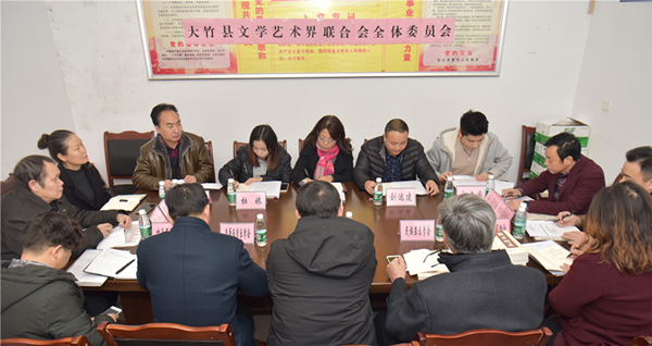 大竹县委宣传部常务副部长谢江总结了大竹县文联近年来的工作和成绩,并对全县今后的文学艺术和县文联工作提出了希望和要求。他指出,要抓好文化领域的意识形态工作,严管文化阵地、文化队伍、文化活动、文化产品,坚决做到去庸俗、远低俗、不媚俗;要坚持以人民为中心的创作导向,扎根人民、扎根群众,创作出有血有肉、充分反映群众火热现实生活的文艺作品;要强化精品意识,打造文艺精品,继续紧扣中国梦、社会主义核心价值观、脱贫攻坚、纪念改革开放等主题,组织创作采风,精心创作、打磨、推出一批文艺精品;要全面总结经验,及早谋划明年,对照达州市文联、县委宣传部、县文联目标考核任务,全面梳理总结2018年工作要点,尽快制定2019年工作计划,推动全县文学艺术事业大发展大繁荣。
