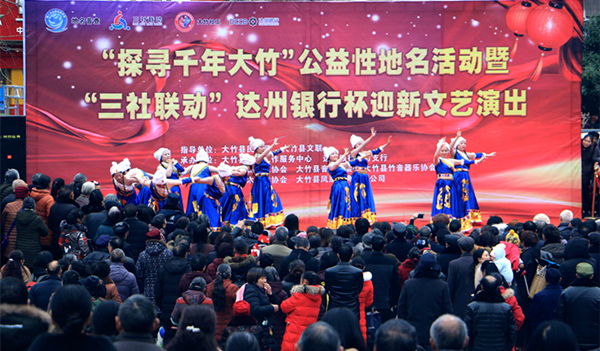 【本网讯】为提升大竹社区、社会组织和社会工作者“三社联动”试点工作水平,深化第二次全国地名普查成果转化,丰富社区群众的文体活动,推进大竹社会治理和地名文化建设新模式、新进程;12月8日,由大竹县民政局、大竹县文联指导,大竹县社会工作服务中心和达州银行大竹支行承办的“探寻千年大竹”公益性地名活动暨“三社联动”达州银行杯迎新年文艺演出在大竹县新华广场举行。