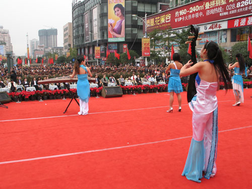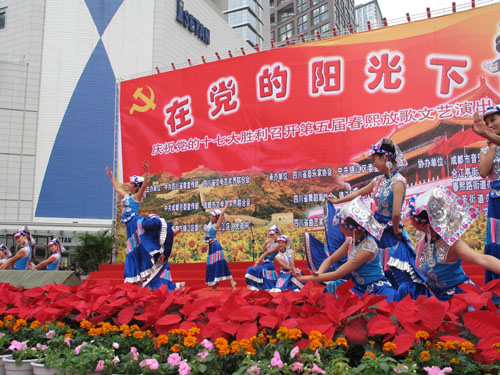 10月20日下午3时至5时,在成都市红星路步行街广场,中共四川省委宣传部、四川省文联、中共成都市委宣传部、成都市文联、中共锦江区委、区人民政府联合主办了第五届“春熙放歌”《在党的阳光下》文艺演出,歌颂中国共产党,隆重庆祝中国共产党第十七次全国代表大会胜利召开。省委常委、省政法委书记王怀臣,副省长张作哈等领导观看了演出。演出的承办单位包括省音乐家协会、中共锦江区委宣传部、省舞蹈家协会、锦江区文化广播电视局、省曲艺家协会、省杂技家协会,协办单位有成都市音协、春熙路街道办事处、合江亭街道办事处、三圣街道办事处、锦江区文化馆。