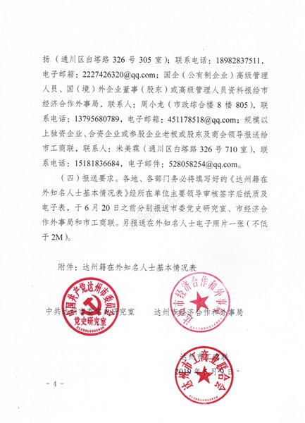 现将中共达州市委党史研究室、达州市经济合作和外事局、达州市工商联《关于征集达州籍在外知名人士资料的通知》转发给你们,请按照文件精神广泛宣传,全面推荐、自荐,6月15日前报市文联办公室汇总后上报。联系人:曹思危,联系电话:2140437,电子邮箱,404410255@qq.com。