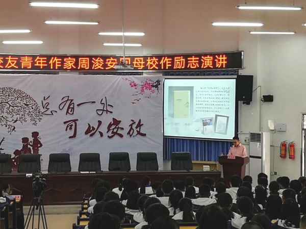 演讲中,周浚安以“总有一处可以安放”为题,分享了自己在宣汉县第二中学求学的历程和十九年来的创作经历,鼓励学弟学妹们要对自己充满信心,坚定不移地追求自己的梦想。前来听讲的同学们聚精会神、深受感染。台上演讲精彩,台下笑声和掌声不断。演讲期间,周浚安还向母校捐赠了自己创作的三部文学作品。