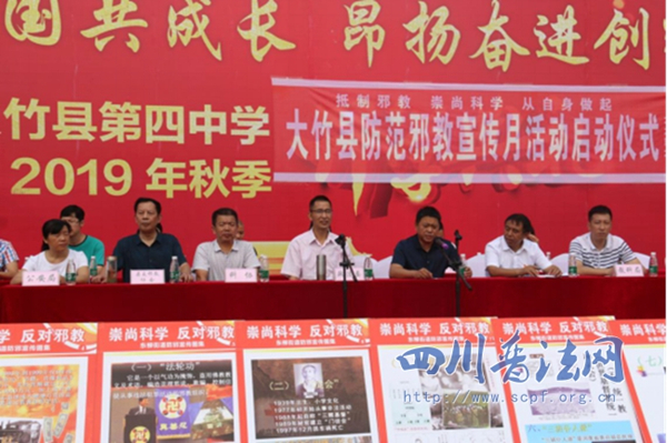 【本网讯】9月4日,由大竹县委政法委主办的大竹县2019年防范邪教宣传月活动启动仪式在第四中学举行。活动以“抵制邪教 崇尚科学 从自身做起”为主题,县公安局、县司法局、县科协、县反邪教协会等多个单位和部门参加活动,县委政法委领导出席活动并讲话。