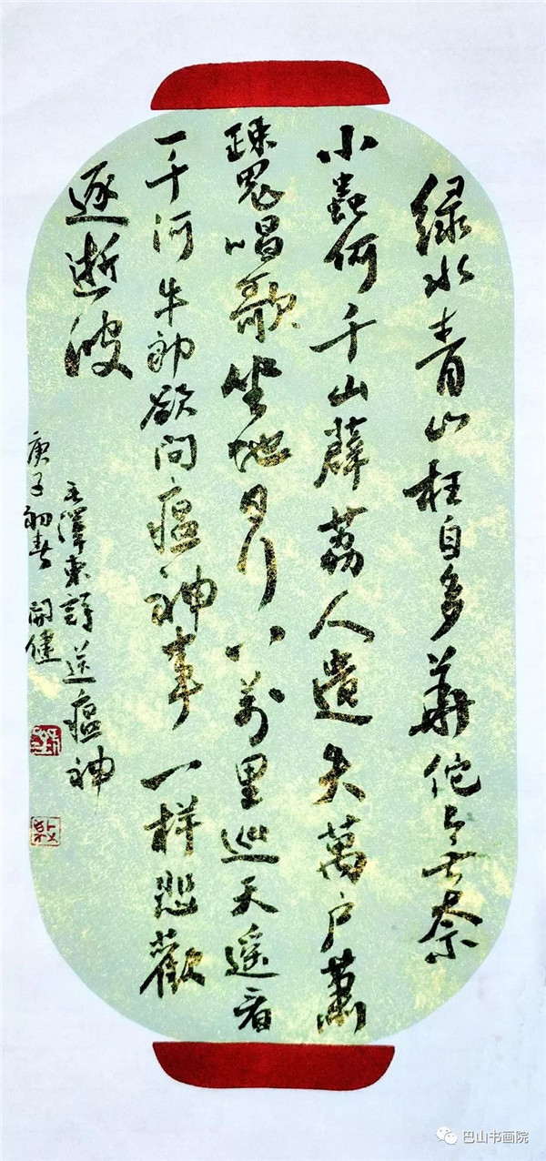 毛泽东诗《送瘟神》 绿水青山枉自多,华佗无奈小虫何! 千村薜荔人遗矢,万户萧疏鬼唱歌。 坐地日行八万里,巡天遥看一千河。 牛郎欲问瘟神事,一样悲欢逐逝波。 尺寸:23cmx46cm 刘开健书