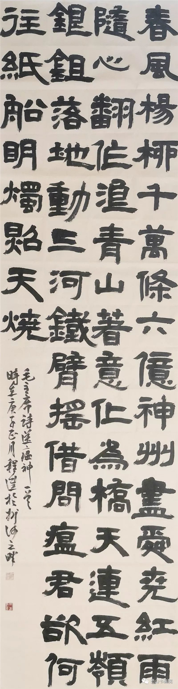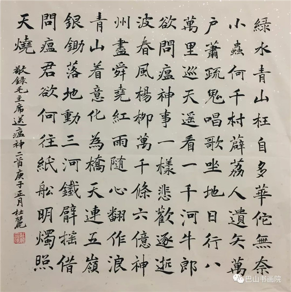 毛泽东《送瘟神》 绿水青山枉自多,华佗无奈小虫何! 千村薜荔人遗矢,万户萧疏鬼唱歌。 坐地日行八万里,巡天遥看一千河。 牛郎欲问瘟神事,一样悲欢逐逝波。 春风杨柳万千条,六亿神州尽舜尧。 红雨随心翻作浪,青山着意化为桥。 天连五岭银锄落,地动三河铁臂摇。 借问瘟君欲何往,纸船明烛照天烧。 尺寸:70cmx70cm 杜丽书