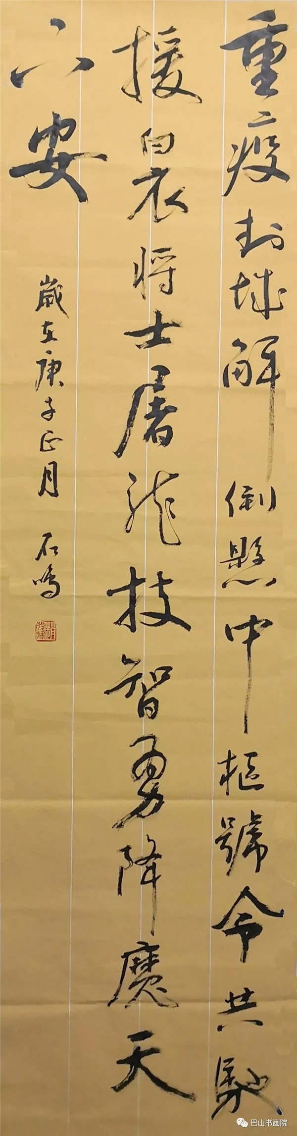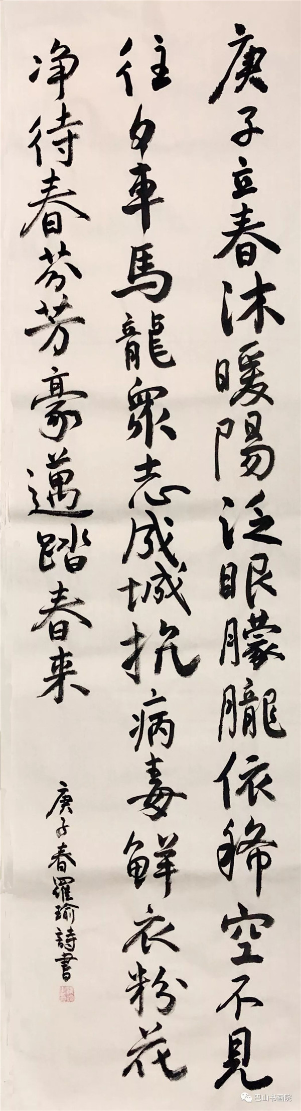 庚子立春沐暖阳 泛眼朦胧依稀空 不见往夕车马龙 众志成城抗病毒 鲜衣粉花净待春 芬芳豪迈踏春来 尺寸:180cm×50cm 罗瑜书