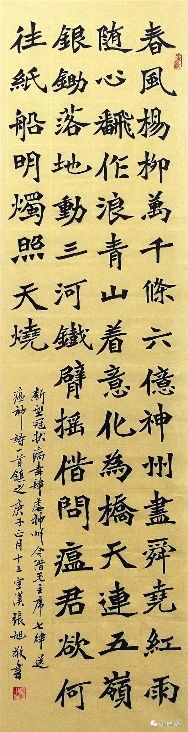 病毒汹汹袭江城,众志成城齐抗争。 疫魔虽顽道更高,春风遍拂捷报频。 文华丹自作诗并书之