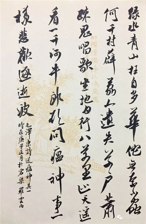 毛泽东 《七律·送瘟神》 绿水青山枉自多,华佗无奈小虫何! 千村薜荔人遗矢,万户萧疏鬼唱歌。 坐地日行八万里,巡天遥看一千河。 牛郎欲问瘟神事,一样悲欢逐逝波。 尺寸:32cmx22cm 罗云雨书