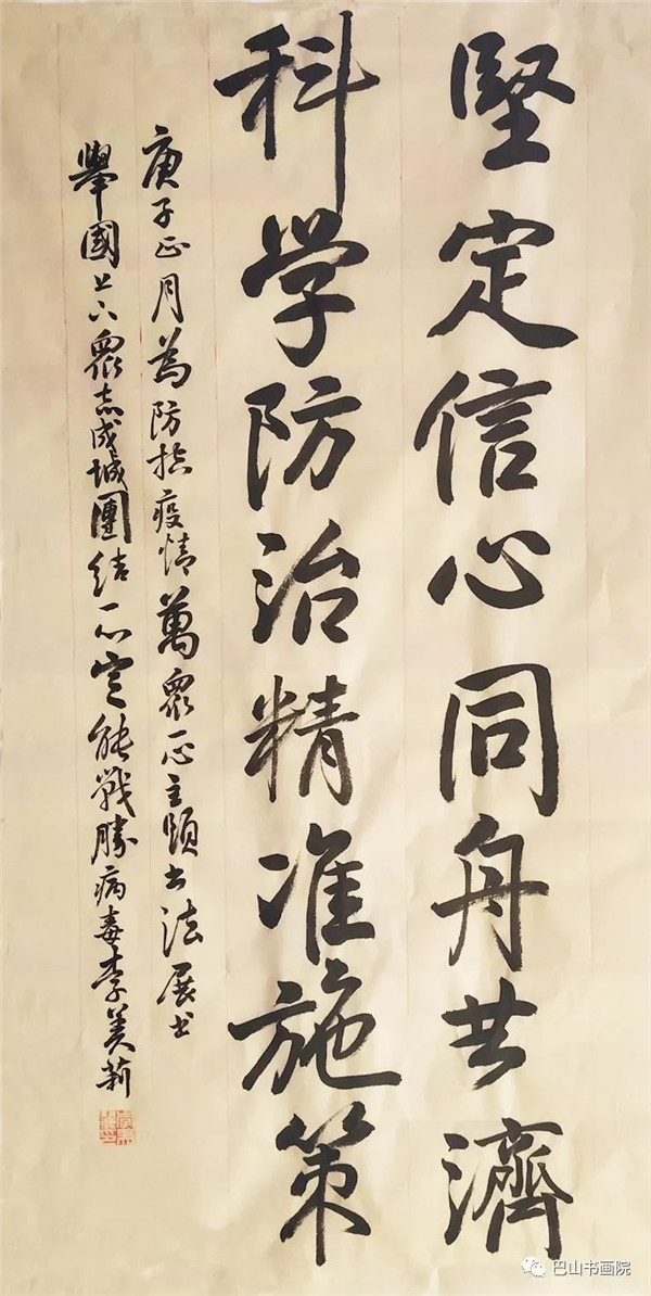 坚定信心,同舟共济。 科学防治,精准施策。 尺寸:48cmx90cm 李美莉书