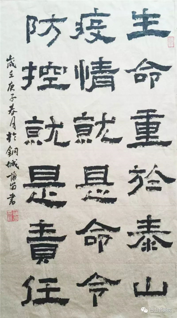 生命重于泰山 疫情就是命令 防控就是责任 隶书 尺寸:41cmx76cm 蒲岗书