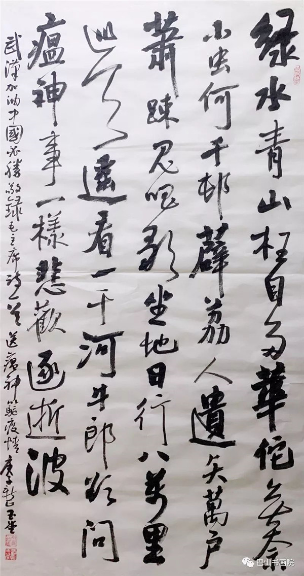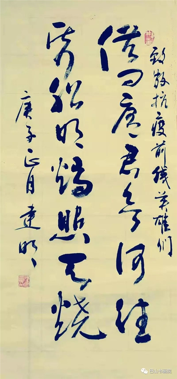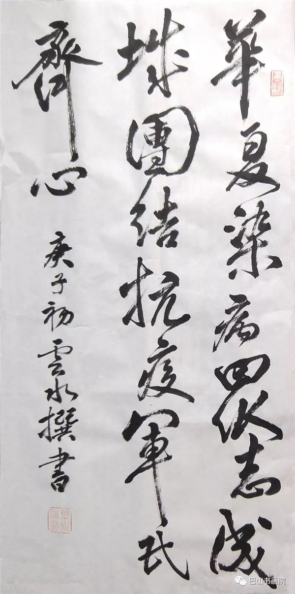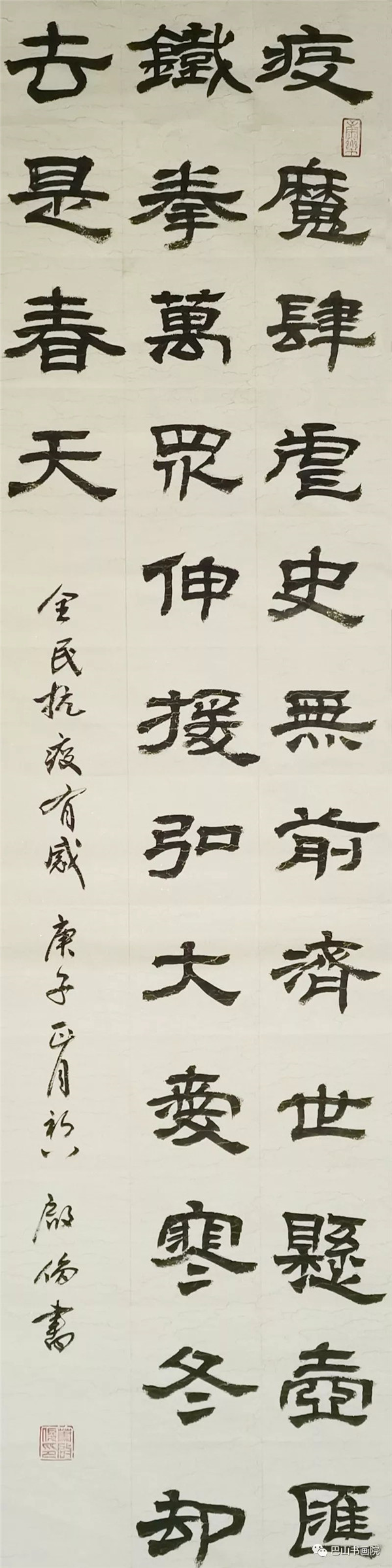 《致武汉》 新冠疫毒降鼠年,美丽江城陷灾难。 伏魔收瘟摄瘴气,白衣天使忙正酣。 万众同赴防控战,胜利到来期未远。 尺寸:180cmx49cm 陈涤生自作诗
