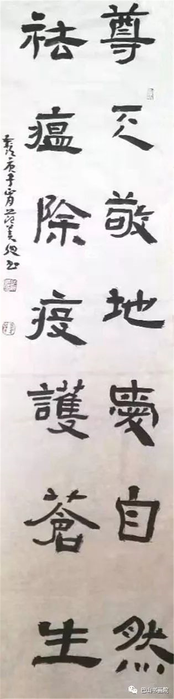 尊天敬地爱自然,祛瘟除疫护苍生。 尺寸:138cmx35cm 范美聪书