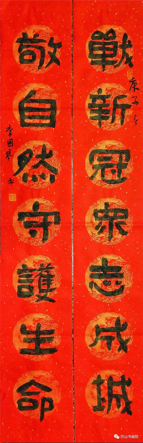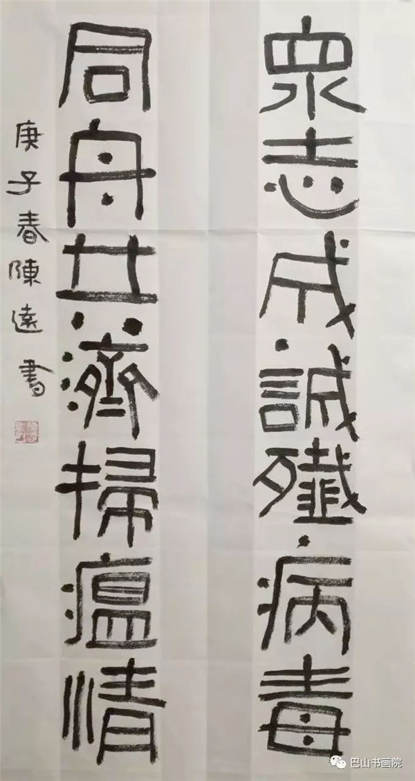 众志成城歼病毒,同舟共济扫瘟情。 尺寸:78cmx40cm 陈远书