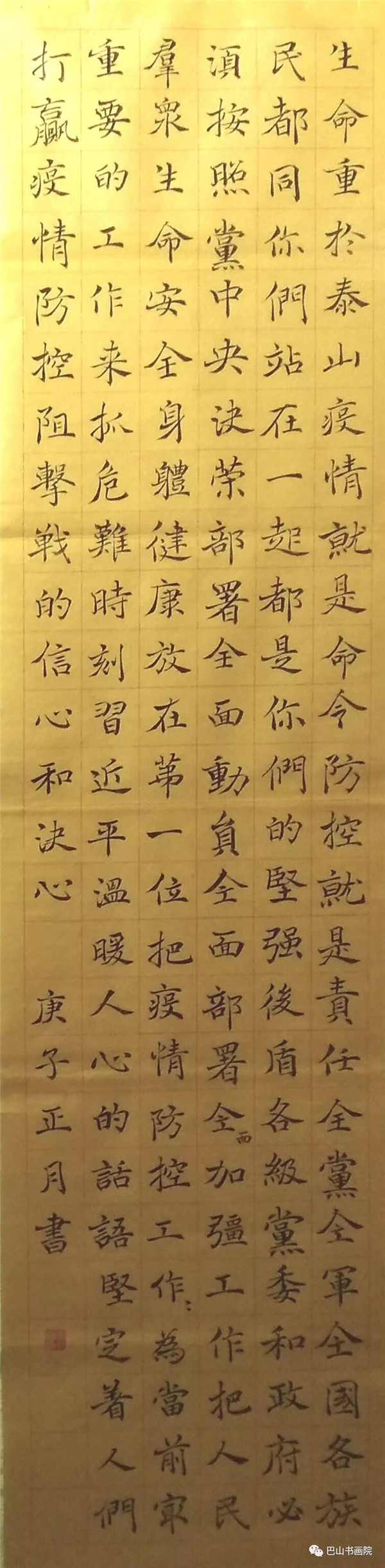 生命重于泰山,疫情就是命令,防控就是责任。全党全军全国各族人民都同你们站在一起,都是你们的坚强后盾。 各级党委和政府必须按照党中央决策部署,全面动员,全面部署,全面加强工作,把人民群众生命安全和身体健康放在第一位,把疫情防控工作作为当前最重要的工作来抓。危难时刻,习近平温暖人心的话语,坚定着人们打赢疫情防控阻击战的信心和决心。 尺寸:138cmx50cm 陈小岚书