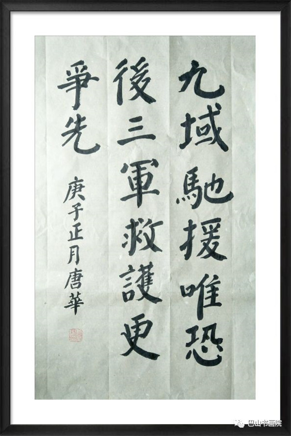 九域驰援唯恐后,三军救护更争先。 尺寸:76.5cmx47.5cm 唐华书
