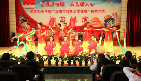 据了解,近年来,达州市戏剧家协会多次组织老艺术家和戏曲专业演员开展“送戏进校园·文艺暖人心”惠民演出活动,同时举办各项戏曲艺术讲座和教学活动,将戏剧表演教学内容结合经典传统剧目名段欣赏,手把手的教授学生学习戏剧艺术表演,极大地激发和培养了学生们对传统戏曲艺术的兴趣,播撒出戏曲艺术种子。自2016年开始,文华街小学就举办了川剧艺术社团,邀请川剧艺术名家走进课堂,培养了一大批热爱川剧艺术的孩子。而该校选送的戏曲节目连续三年参加第三届、第四届、第五届四川省中小学生川剧艺术传习普及展演均获得一等奖,学校也被授予“国家级非物质文化遗产川剧中小学传习普及基地”称号。