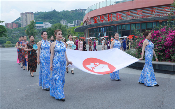 下午15时,金华社区活动中心广场上佳丽云集,大家随着《旗袍之歌》优美的旋律翩翩起舞。随后,佳丽们排着缤纷长龙,在悠扬婉转的《梦里水乡》伴奏下,沿着公园轻移莲步、款款巡游。