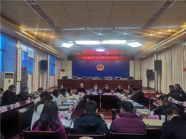启动仪式上,开江县委宣传部副部长、县文联主席陈俐静组织与会人员集中学习了习近平总书记在中国文联十一大、中国作协十大开幕式上的重要讲话精神。她表示,开江县文联将以“12543”工作法,争塑一流基层文艺队伍,建好线上线下两类阵地,持续开展文艺“五进”活动,加大四级文艺平台报送推介力度,实施“三奖”激励机制,围绕中心,服务大局,多出精品,多出人才。希望开江作家们不负信任,书写蓝盾故事;不负家国,书写田城故事;不负时代,书写精品故事,迎接党的二十大胜利召开;同时向人民警察们送去节日的祝福。