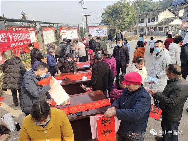 笔墨凝书香,新春送万福。村民听闻书法家们要到小山村送“福”贴、送春联,提前搭好书写案桌,心生欢喜。由市书法家协会主席马骏华带领的送福队伍在做好疫情防护措施下,挂好提前书写的春联、“福”字,应着村民的要求,用手中的笔墨尽情挥洒,红彤彤的春联、别致的福帖,把满满的关怀、浓浓的年味、新春的祝福送到每一户平常百姓家中,为乡村振兴添了一抹新春的色彩,为山村增添了欢乐祥和的节日文化氛围。