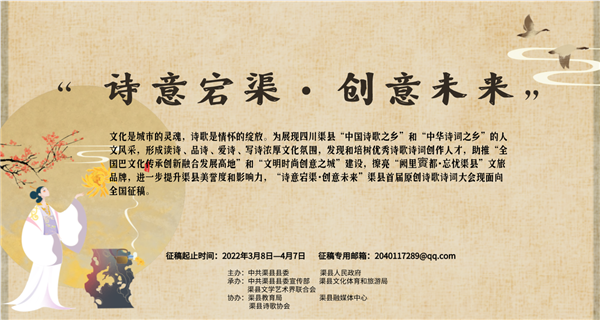 文化是城市的灵魂,诗歌是情怀的绽放。为展现四川渠县“中国诗歌之乡”和“中华诗词之乡”的人文风采,形成读诗、品诗、爱诗、写诗浓厚文化氛围,发现和培树优秀诗歌诗词创作人才,助推“全国巴文化传承创新融合发展高地”和“文明时尚创意之城”建设,擦亮“阙里賨都·忘忧渠县”文旅品牌,进一步提升渠县美誉度和影响力,“诗意宕渠·创意未来”渠县首届原创诗歌诗词大会现面向全国征稿。