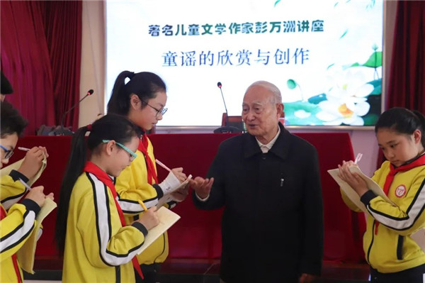 活动中,彭万洲首先向孩子们强调了阅读的重要性,希望孩子们多阅读,与书籍为伴。紧接着结合自身创作经历,通过展示《大蒜》《小羊》《小板凳》等童谣作品深入浅出地讲解了什么是童谣以及童谣的特点、类别等。