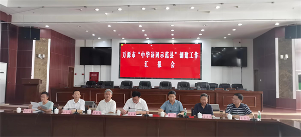 随后通过查阅资料、听取汇报等方式进行验收检查,在验收汇报会上,万源市委副书记、市长朱挺介绍了“中华诗词示范县”创建基本情况。长期以来万源以传承弘扬中华诗词文化、拓展社会主义精神文明建设内涵为目标,持续发力、久久为功,推动创建工作走深走实,从阵地、队伍、氛围等多方面着手,切实做到诗词文化与文旅融合、精神融入、史志融汇,诗教工作入脑入心,确保创建取得实效。